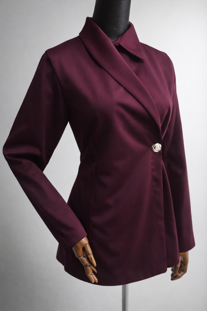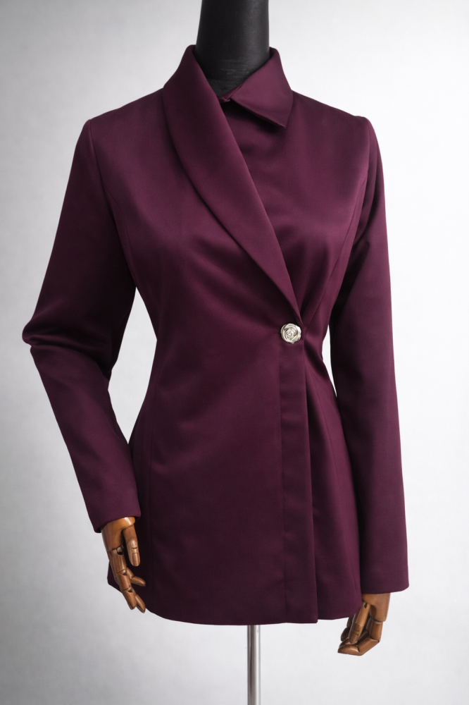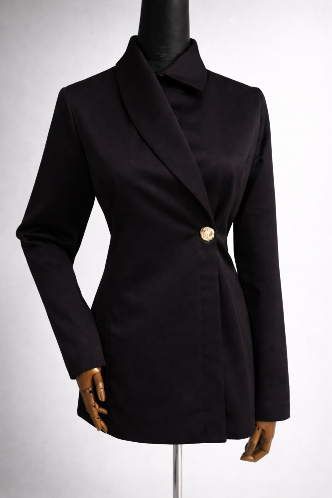 سترة كلاسيكية غير متماثلة تجسد الأناقة العصرية الراقية. يتميز تصميمها بقصة منظمة تبرز جمال القوام، مع إغلاق غير متماثل يضفي لمسة فريدة وأنيقة. مصنوعة من قماش ناعم ومقاوم للماء، ومزوّدة بـ بطانة داخلية تمنح راحة مثالية وثباتًا أنيقًا. تزينها زرّة فاخرة على شكل جوهرة تضيف لمسة أنثوية فاخرة. مثالية للإطلالات المهنية، الأنيقة أو للمناسبات الخاصة، وتُعد قطعة أساسية في خزانة المرأة العصرية.