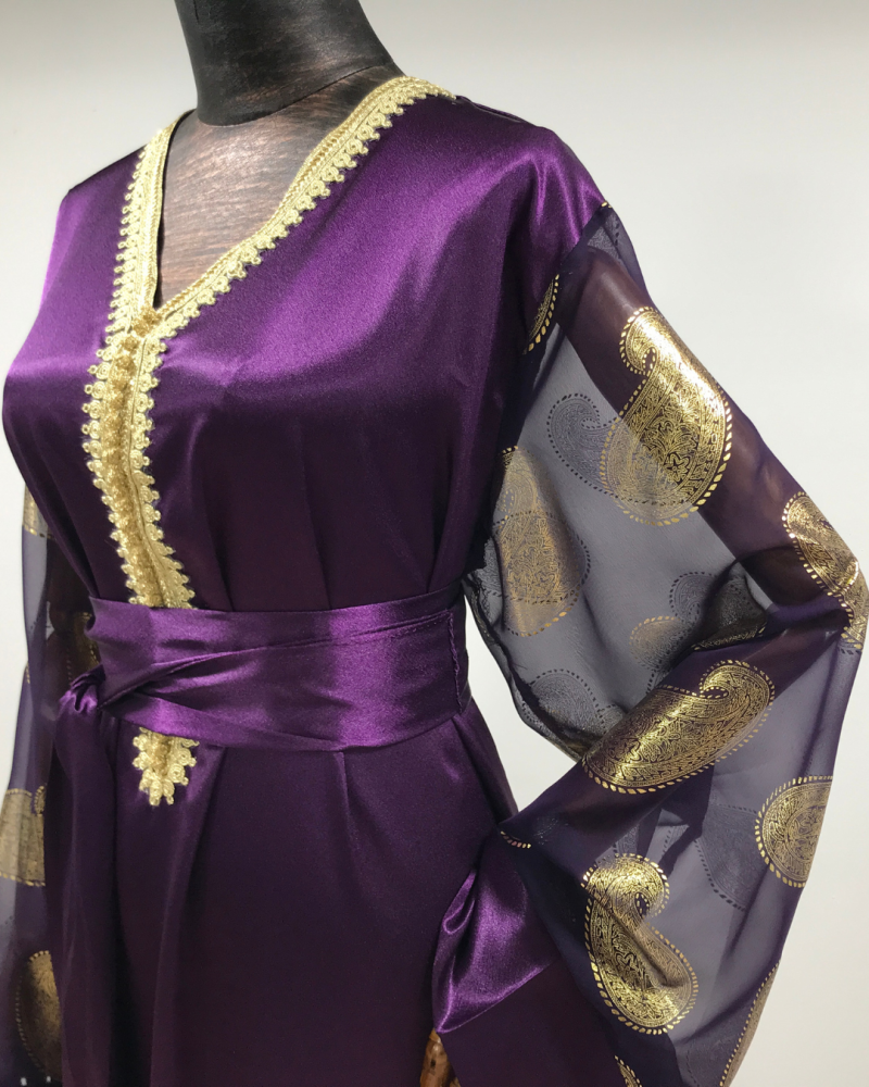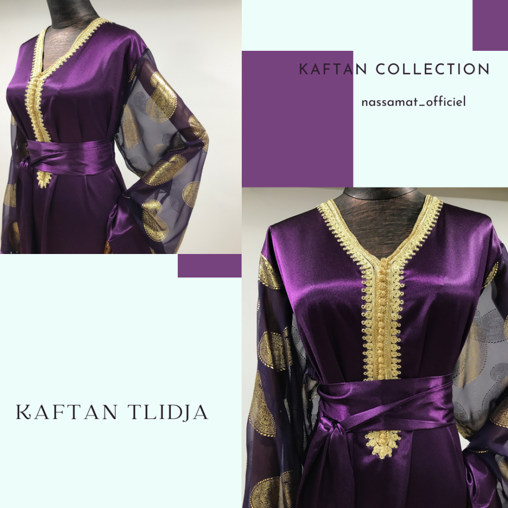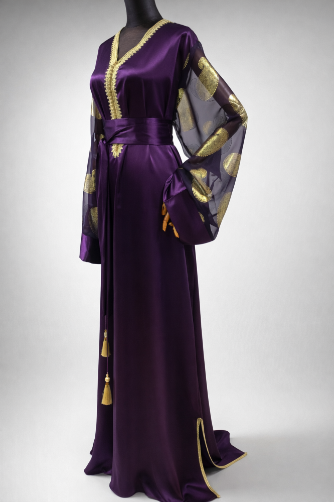 الأكمام المصنوعة من التليدجا المطبوعة تضيف لمسة حرفية فاخرة وتخلق تباينًا جذابًا مع لمعان الساتان. ويأتي تصميم أسفل القفطان مع شقّين جانبيين ليمنح حرية في الحركة ويضفي أنوثة راقية ولمسة جاذبية ناعمة.