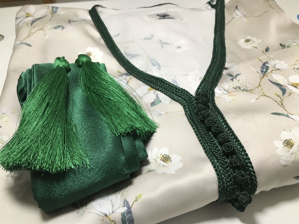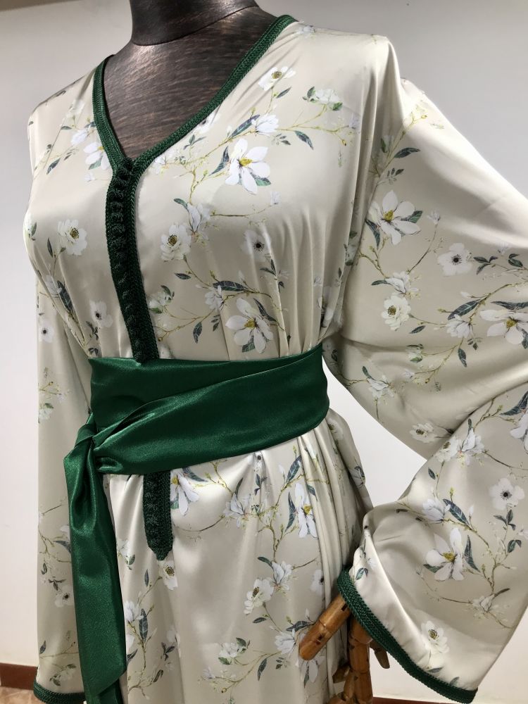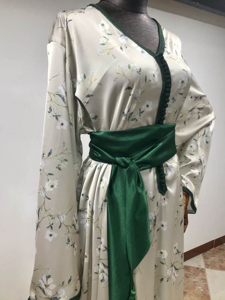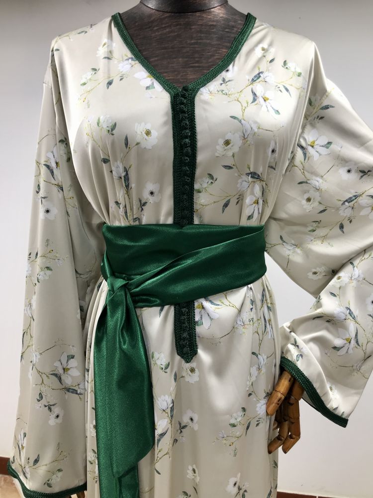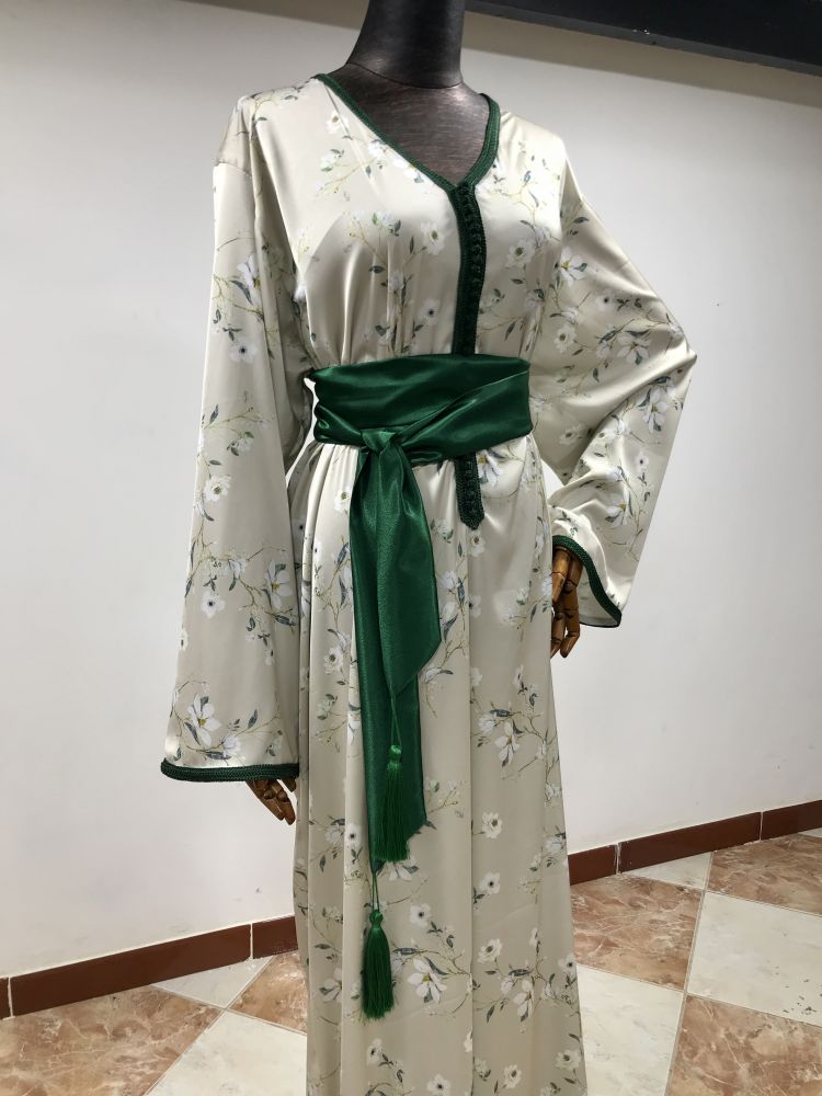 قفطان أنيق مصنوع من ساتان أرماني الفاخر، مثالي لإطلالة راقية في عيد الفطر أو عيد الأضحى. يتميز بقماش ناعم وانسيابي مزين بنقوش زهرية رقيقة تضفي لمسة من النعومة والانتعاش.