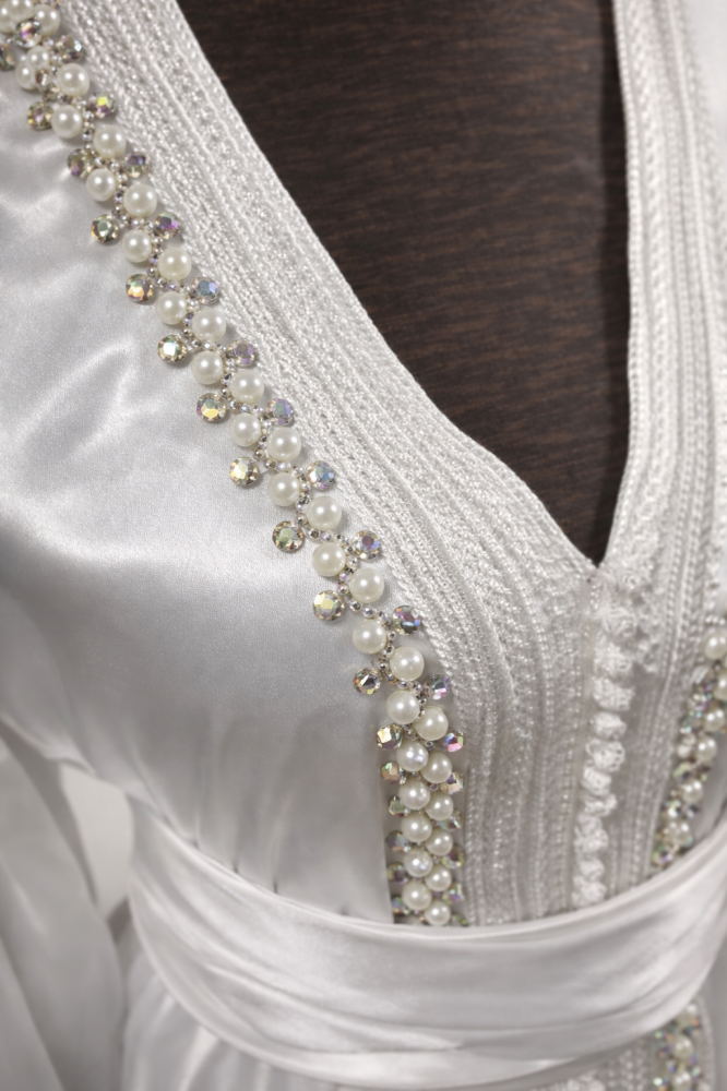 قفطان أبيض من الساتان غير شفاف بانسيابية ولمعان راقٍ، مزين بحبات اللؤلؤ والكريستال اللامع على طول فتحة الصدر بشكل V وفي الأمام. يبرز الحزام العريض الخصر بأناقة، بينما تضيف الأكمام الواسعة لمسة من النعومة والرقي.